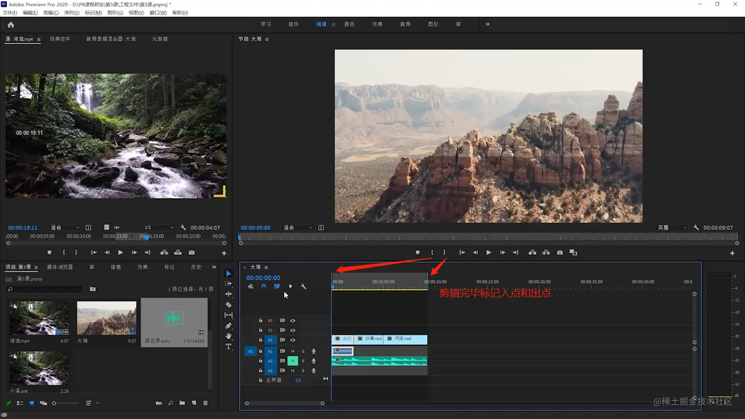 6. 利用标记入点和出点工具将我们剪辑好的视频标记出来。