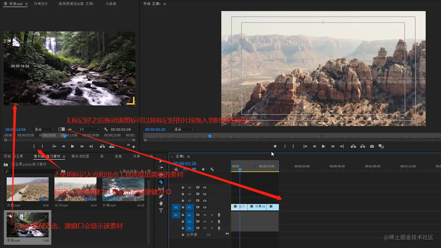 - 双击项目面板中的素材,就可以在源窗口显示,使用源窗口上的标记入点和标记出点工具可以快速标记出想要的素材片段。使用仅拖动视频工具可以将标记好的视频片段拖入到时间线面板上。
