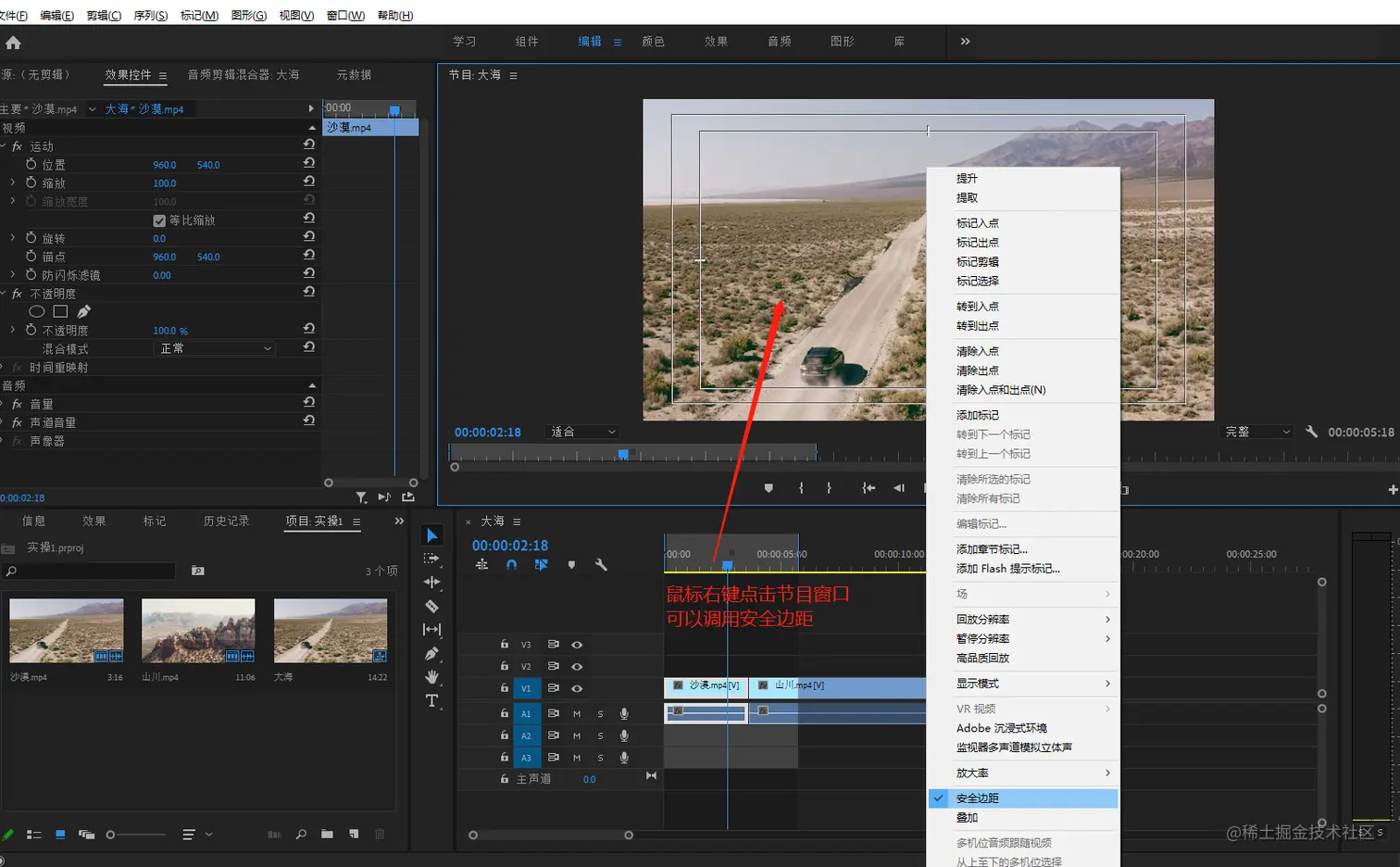 - 节目窗口各个小工具的使用方法(安全边框、入点、出点)。