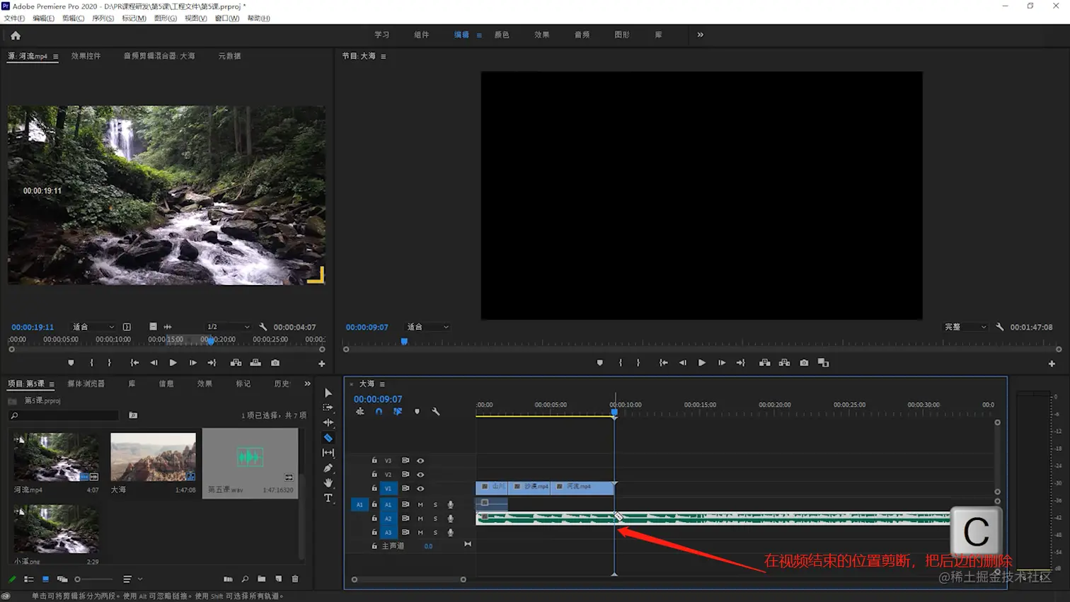 - 源窗口粗剪视频完成后,3段视频都在时间线上了,我们可以利用剃刀工具快捷键为
