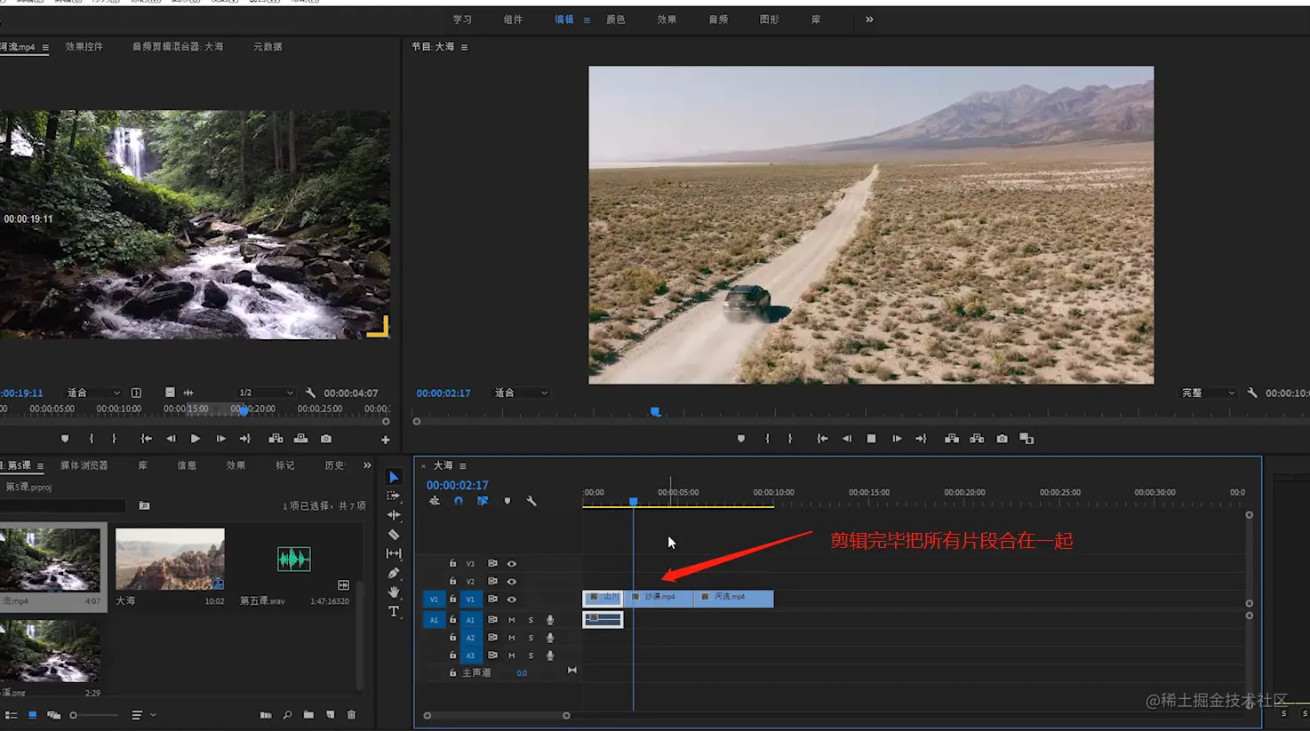 - 所有片段精细剪辑完毕都把视频片段前后连接在一起。
