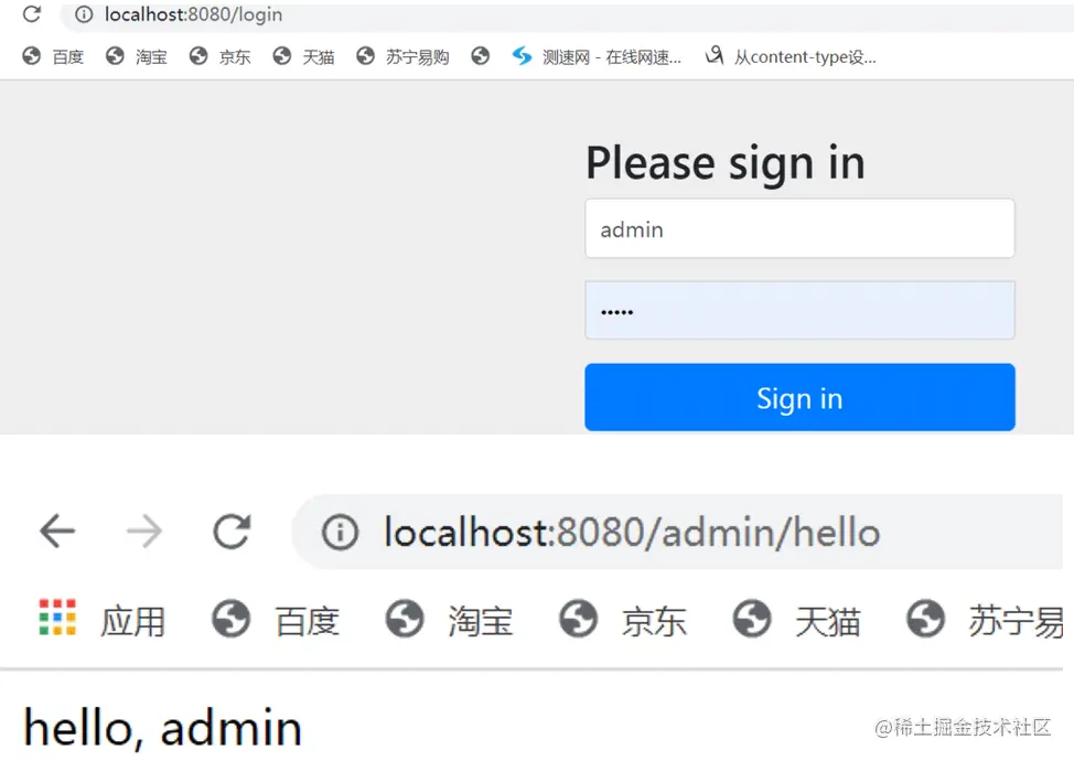 在访问/admin/**,/user/**等接口时就会跳转到如下登录界面,登录认证成功后,会跳转到对应的接口访问页面。