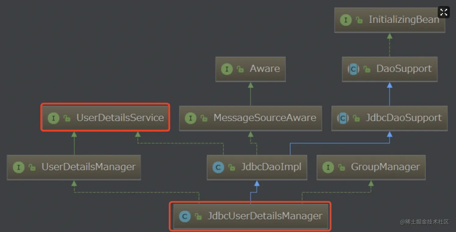在上一章节中,我给大家介绍了一个JdbcUserDetailsManager类,其结构关系如下图所示: