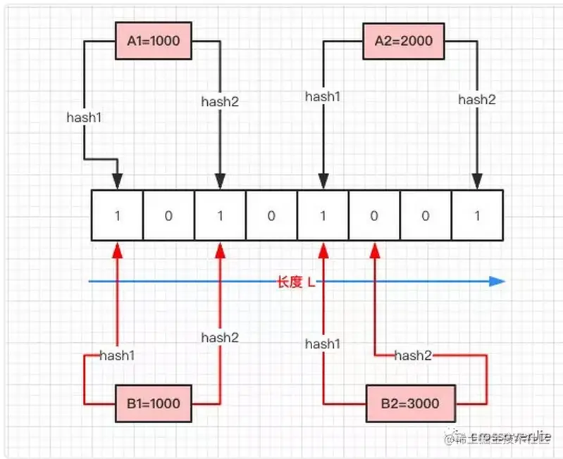 - 当写入一个 A1=1000 的数据时,需要进行 H 次 hash 函数的运算(这里为 2 次);与 HashMap 有点类似,通过算出的 HashCode 与 L 取模后定位到 0、2 处,将该处的值设为 1。