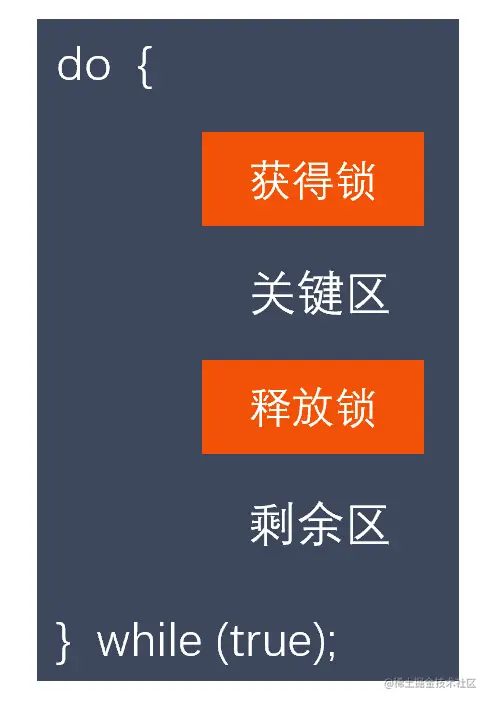 我们采用互斥锁保护临界区,从而防止竞争条件。也就是说,一个线程在进入临界区时应得到锁;它在退出临界区时释放锁。函数 acquire() 获取锁,而函数 release() 释放锁,如图 :