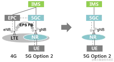 另外在 5G 部署初期,NR会和 4G 重叠覆盖,话音可先选择 EPS FB;然后再演进到 VoNR, 如下:
