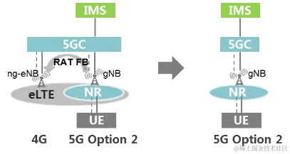或者在 5G 部署初期,NR 会和 eLTE重叠覆盖,话音可先选择 RAT FB;然后再演进到 VoNR,如下: