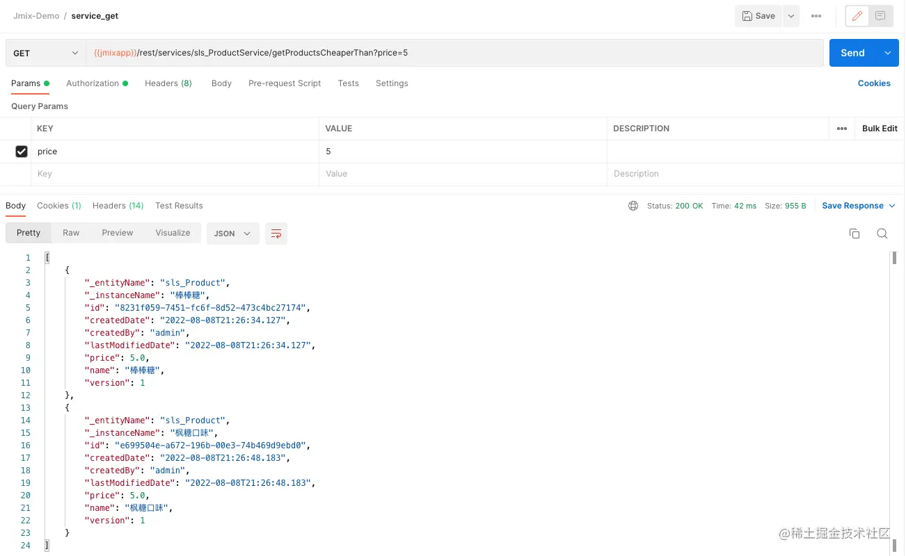 服务中,我们使用了 Jmix 的 DataManager 和 JPQL 查询语句加载实体,并使用方法的输入参数作为 JPQL 的参数。Jmix 的持久层也支持 Spring Data Repository 或者 MyBatis。而使用 DataManager 的一个好处是可以利用 Jmix 的安全机制,控制 API 调用方对实体的访问权限。
