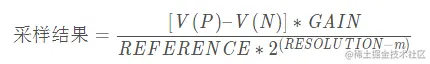 ADC 输出的采样取决与 CH[n].CONFIG 和 RESOLUTION 寄存器配置的参数,采样结果计算公式如下: