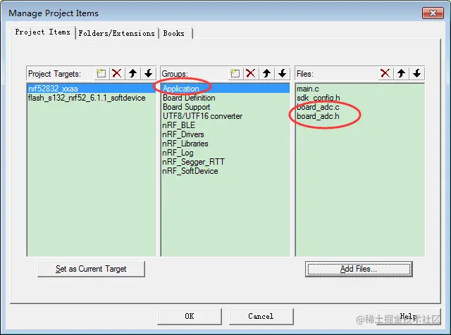 将 board_adc.c 和 board_adc.h 两个文件加入工程的Application文件夹下
