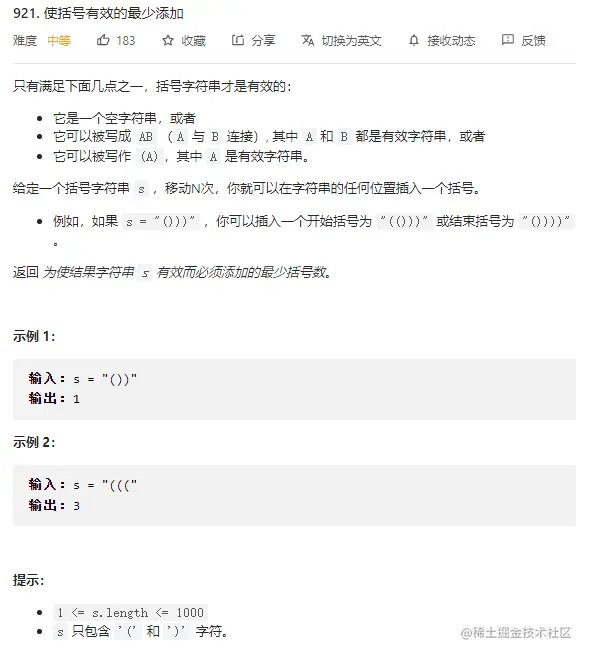 这是 力扣上的 921. 使括号有效的最少添加,难度为 中等。