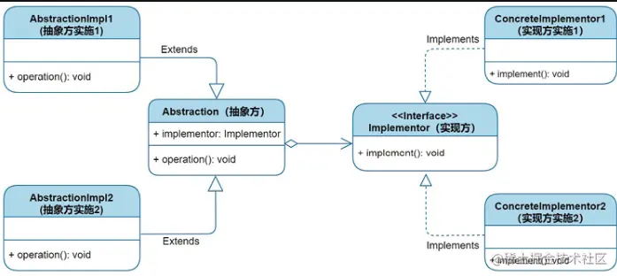 我们可以把桥接模式分为“抽象方”与“实现方”2个维度阵营,其中各角色的定义如下。
