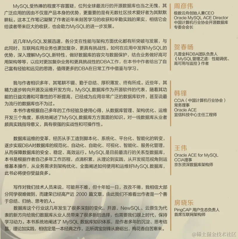 数据库这个行业这几年发生了很多深刻的变化,开源、NewSQL、云原生为代表的新方向给我们数据库从业人员带来了很多新的选择,也需要我们跟上时代,保持学习动力。希望本书中系统阐述的MySQL数据库知识体系,可以给大家带来意想不到的收获!!!