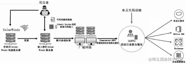 通过产品或应用提供商开展供应链攻击主要是围绕第三方系统、 应用或设备开展工作,利用各种手段获取第三方提供商的原厂设备或 应用源码,并对设备进行解剖分析或对源码进行代码审计以寻找其可 能存在的安全漏洞,进而利用发现的漏洞实现对目标网络的突破。实 战攻防演练中常用的第三方应用源码获取方式主要有两种:一种是通 过公开手段,在公网GitHub、Gitee、凌风云之类的互联网资源库中搜 集相关的应用源码,这类源码主要是由开发人员无意中泄露或公开发 布的;另一种手段是通过渗透控制第三方提供商,控制第三方开发资 源库获取相关设备或应用源码,或者直接通过第三方提供商内部获取 设备或应用的安全缺陷或后门。对第三方资源的利用则包括自主挖掘 漏洞或原有后门利用、更新包捆绑恶意代码并推送、对应用开发依赖 文件包进行恶意代码植入等,借助第三方设备或应用打开目标网络的 突破口,如SolarWinds供应链攻击(见图3-13)。
