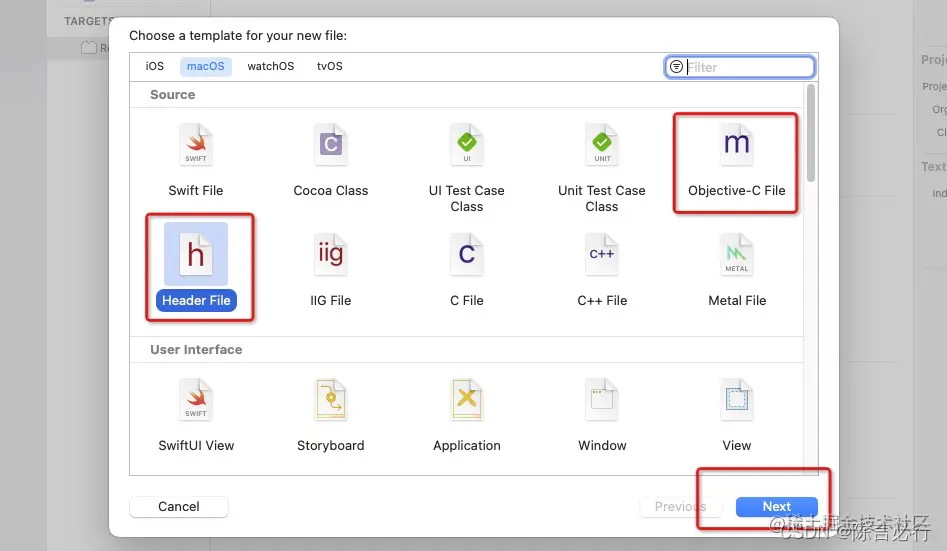 在工程上右键 --> New File... 分别创建.h和.m文件: