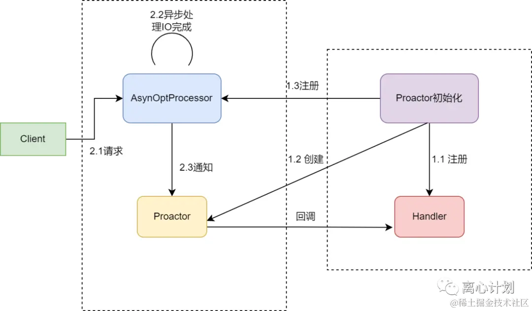 AcynOptProcessor完成IO操作后通知Proactor并回调用户空间的Handler(内核态到用户态的切换)