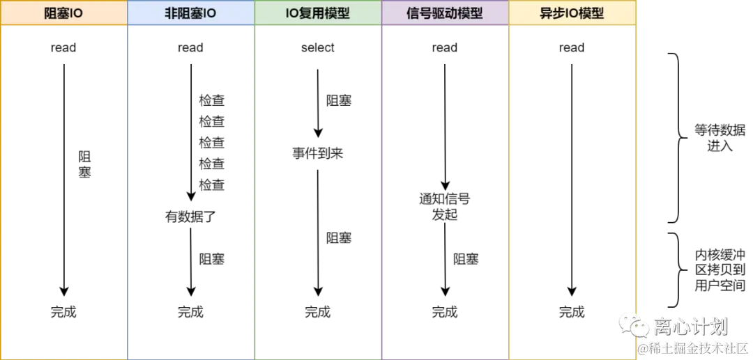 针对用户进程调用read读取网络IO数据的过程,映射到不同IO模型上时,就是这样: