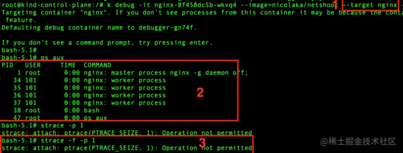 本例给临时容器添加了执行SYS_PTRACE的权限,但具体给什么权限取决于所用的调试器,或者简单点可以给临时容器特权访问,从而不需要担心需要允许哪个系统调用。