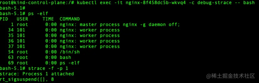 另外,可以从临时容器访问nginx容器的文件系统。根文件系统位于/proc/<process-id>/root目录下。