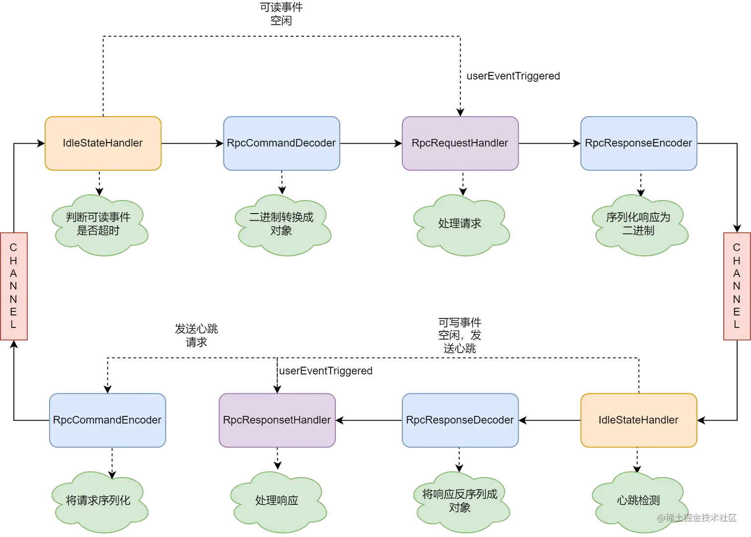 用于处理对应Channel上发生的任何事件,事件类型主要有两种:Channel状态变化和Channel读写数据变化。