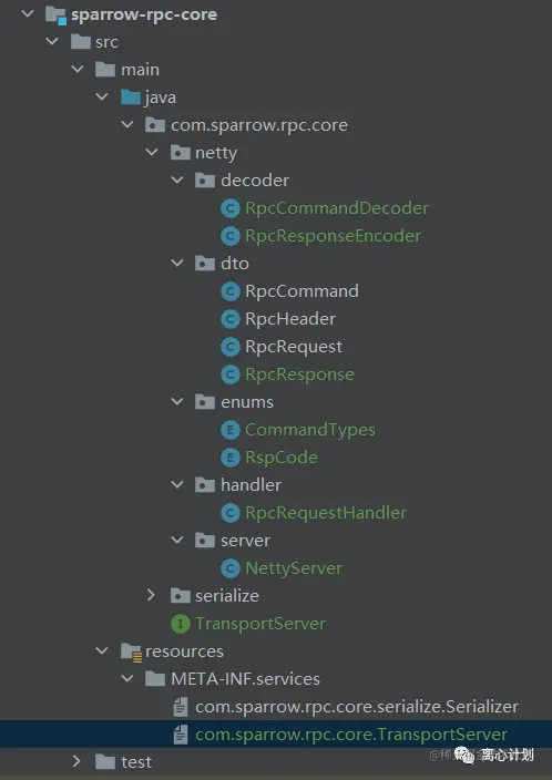 然后创建一个NettyServer实现类,根据上面Netty的组件我们需要定义一个Channel以及两个EventGroup,为了使用在我们序列化小节提到的SPI机制创建一个配置文件(com.sparrow.rpc.core.TransportServer)指向NettyServer