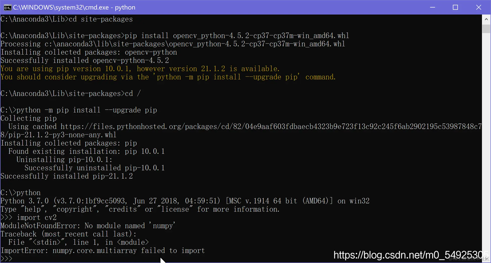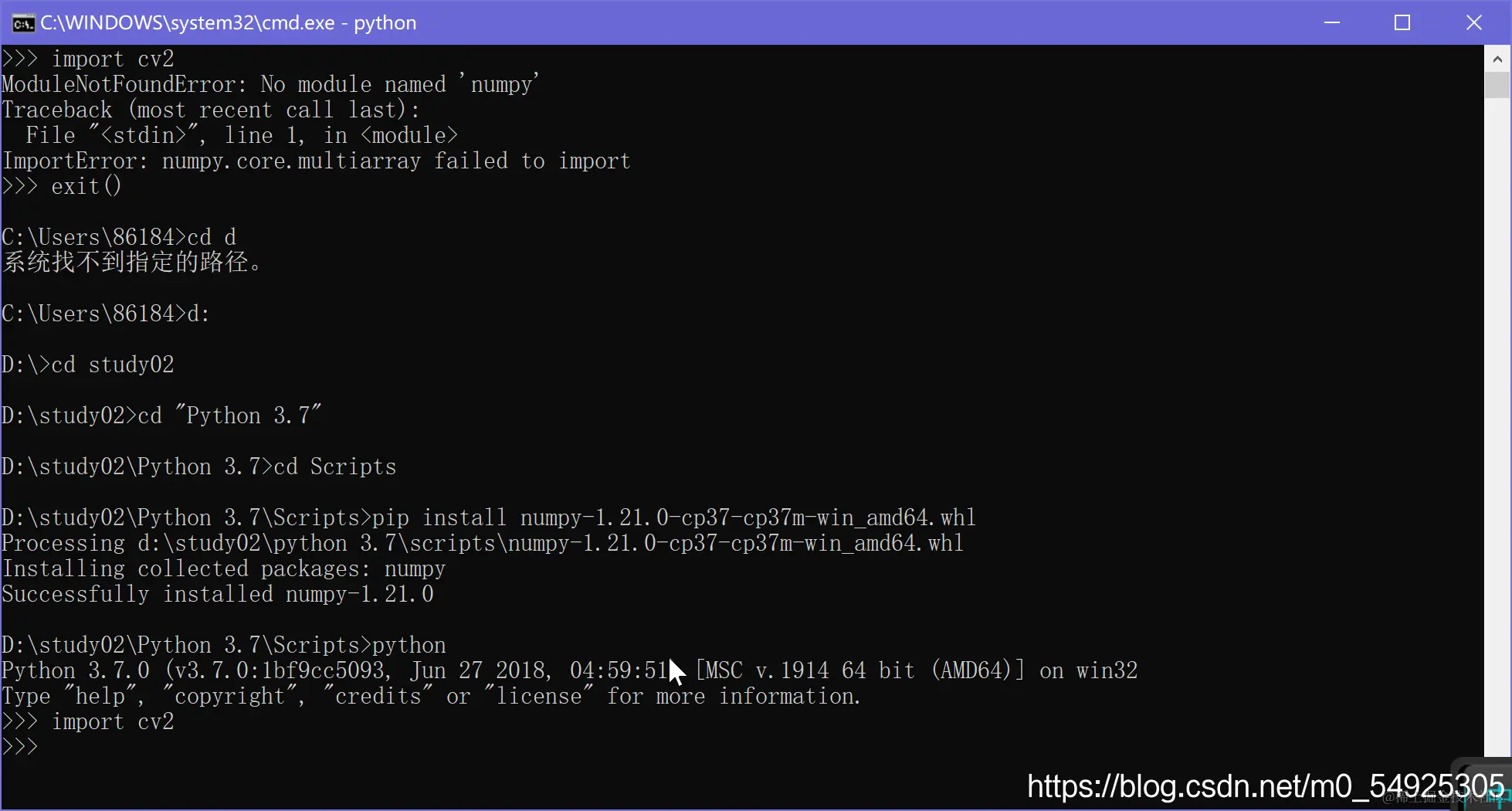 安装成功后,测试导入cv2模块发现导入成功
