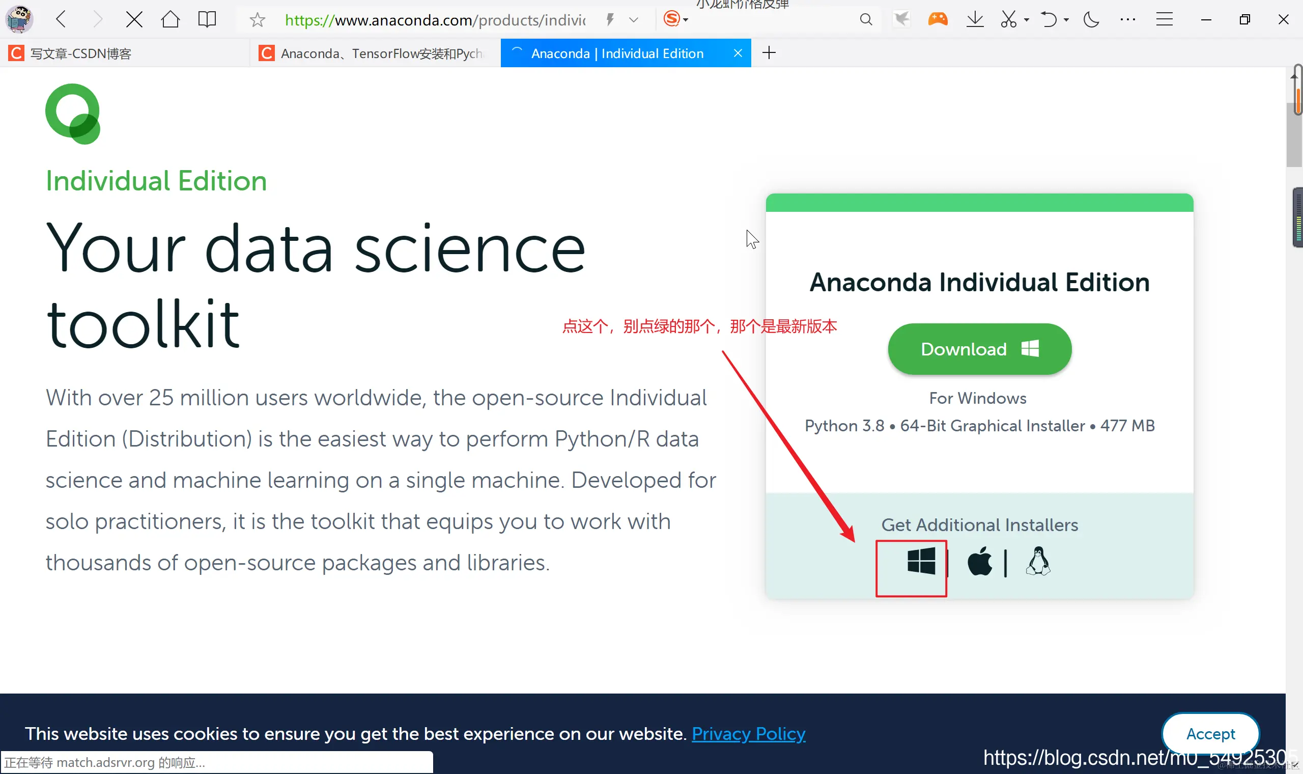 Anaconda下载网址:www.anaconda.com/distributio… ,这里我的是Windows64位系统python3.8。