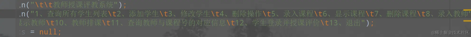 System.out.println("\t\t教师授课评教系统");