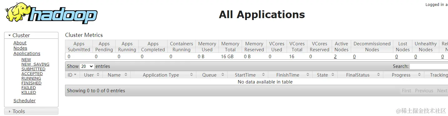 测试YARN,在虚拟机浏览器地址栏中输入“http://master:8088”,打开Web控制台,可以查看集群状态,如果DataNode中没有配置yarn-site.xml,则在网页中无法看到节点信息;如果配置了yarn-site.xml,则在网页中将会看到节点配置信息,如图所示。