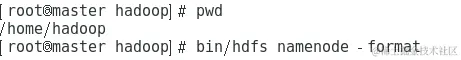 首次启动Hadoop集群时,需要在master节点执行节点的格式化操作,即执行命令“bin/hdfs namenode -format”,如图所示。