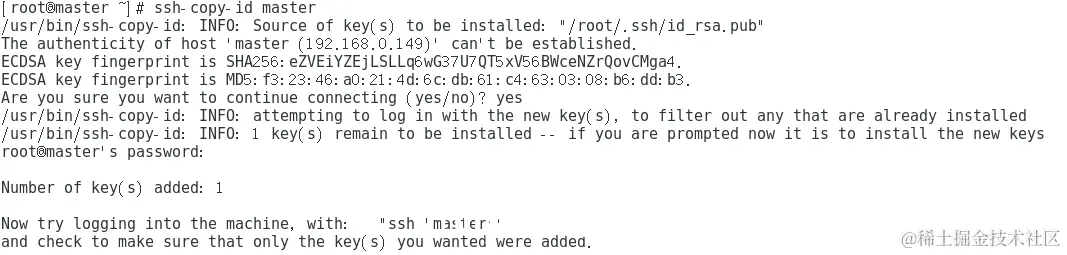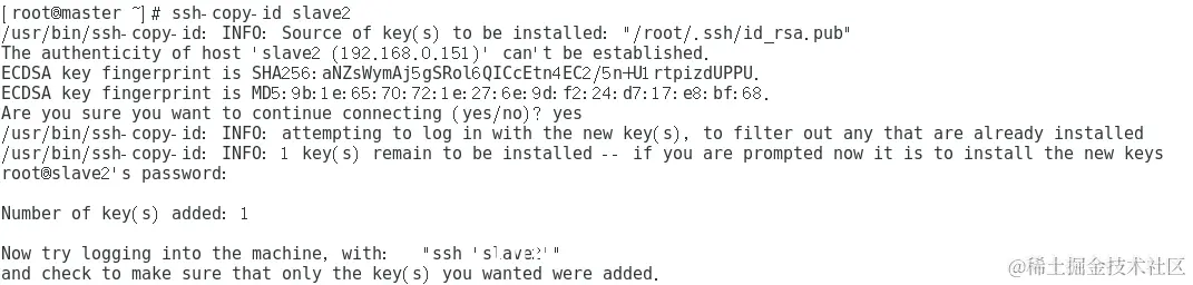 在各Slave节点上,需要注意的是执行“ssh-copy-id [主机名]”命令时,需要更换[主机名]为“master”,“slave1”或“slave2”。