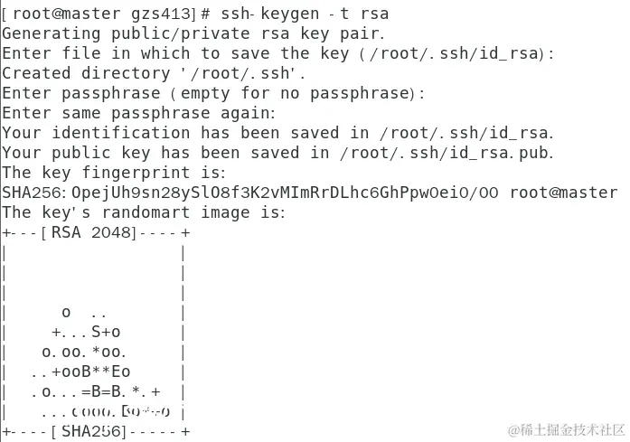 执行命令“ssh-keygen -t rsa”并且依次在系统等待输入时直接回车(一共4次回车)后,即可生成密钥对,如图所示。