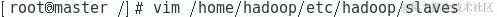 (2)配置slaves文件,执行命令“vim /home/hadoop/etc/hadoop/slaves”将master节点仅作为NameNode使用,将slaves文件中原来的localhost删除,并添加内容,如图所示。(注意文件内容不能留有其他空格)