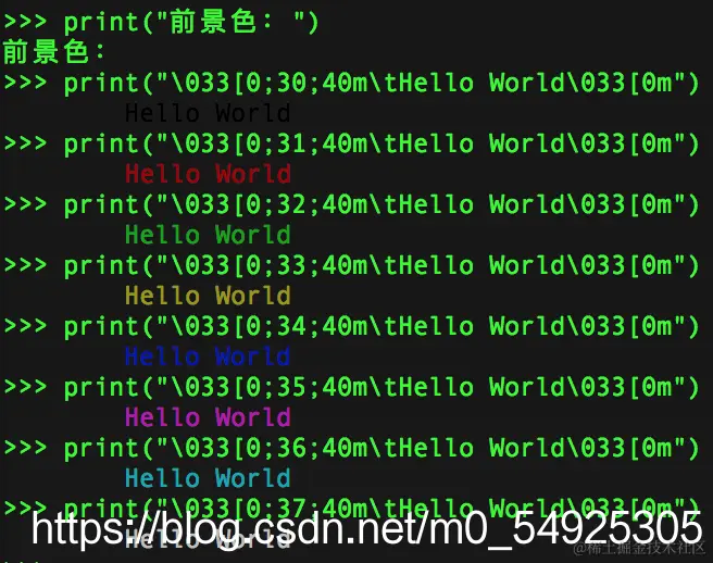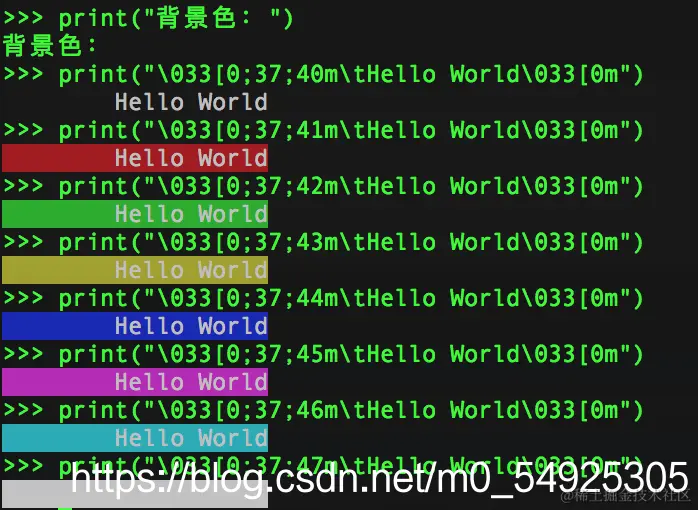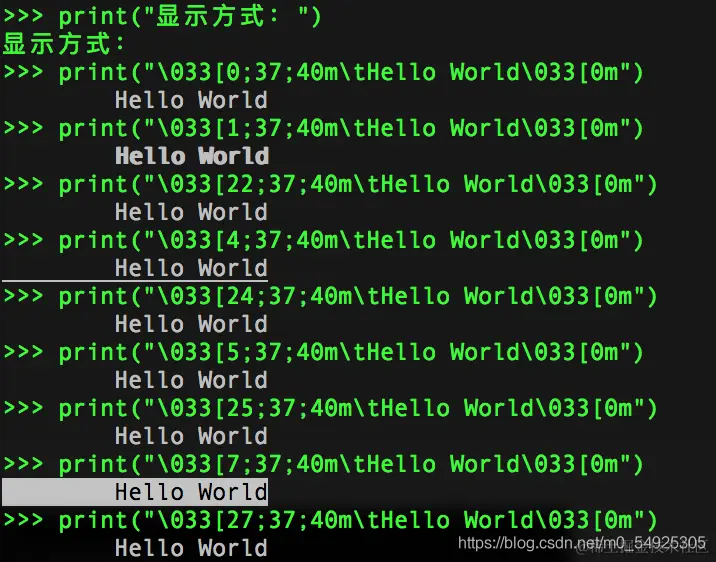\033[显示方式;前景色;背景色m + 结尾部分:\033[0m