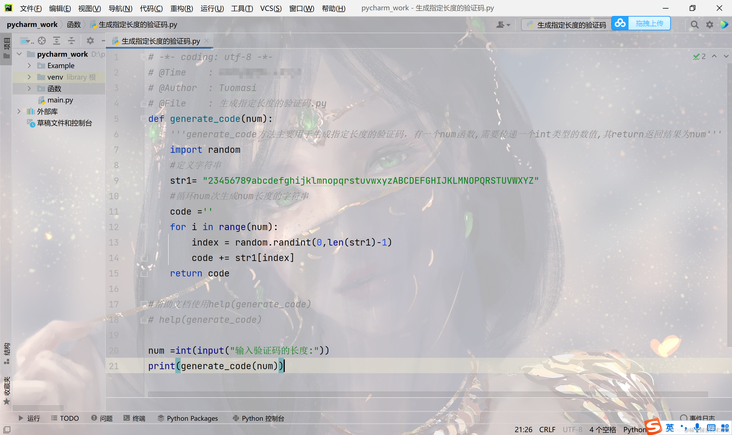 使用Python语言生成指定长度的验证码,一般验证码的逻辑基本相似,可以根据需求后期添加图形化界面,制作成一款app的小插件,或者做成网页形式的验证码提交页面。
