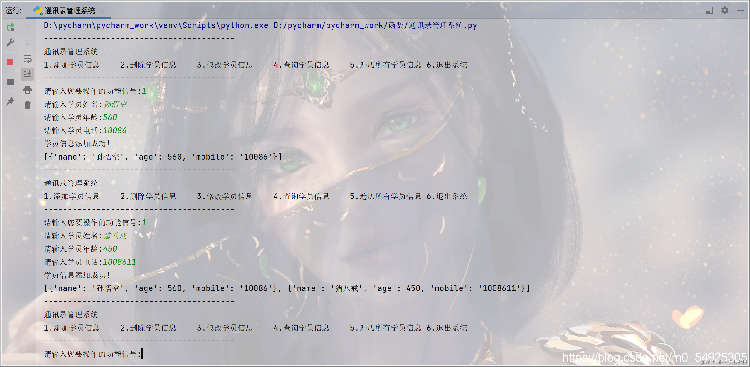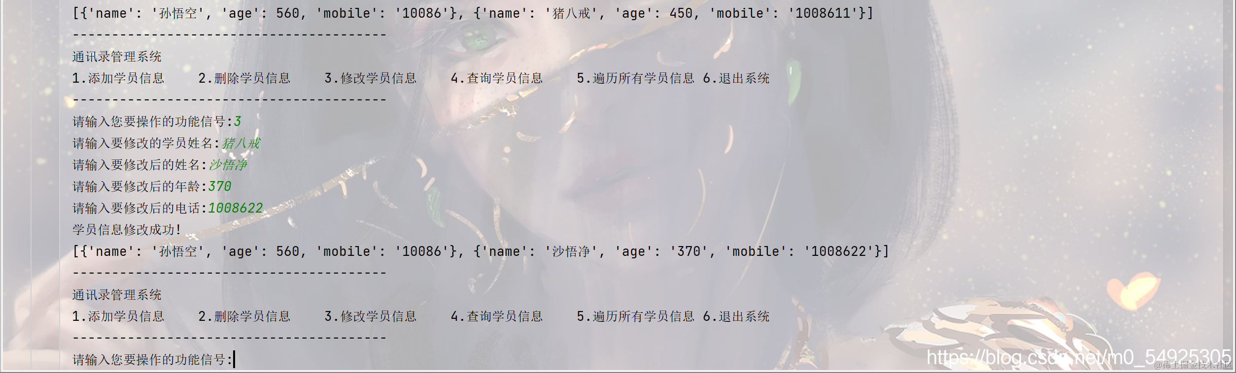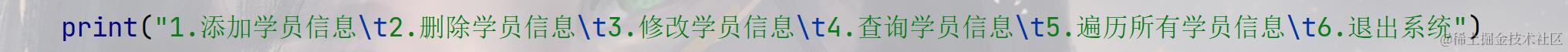 print("1.添加学员信息\t2.删除学员信息\t3.修改学员信息\t4.查询学员信息\t5.遍历所有学员信息\t6.退出系统")