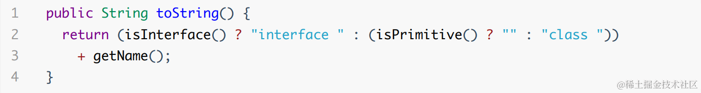 toString()方法能够将对象转换为字符串,toString()首先会判断Class类型是否是接口类型,也就是说,普通类和接口都能够用Class对象来表示,然后再判断是否是基本数据类型,这里判断的都是基本数据类型和包装类,还有void类型。