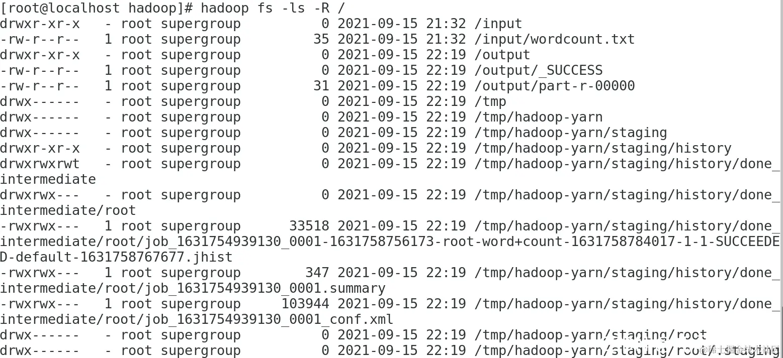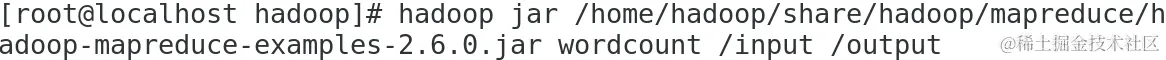 注:使用hadoop jar命令 +mapreduce自带的jar包路径(绝对路径)+文件名+输入路径+输出路径 #此处jar包根据自身实际情况进行修改