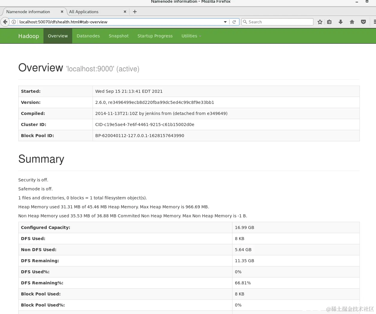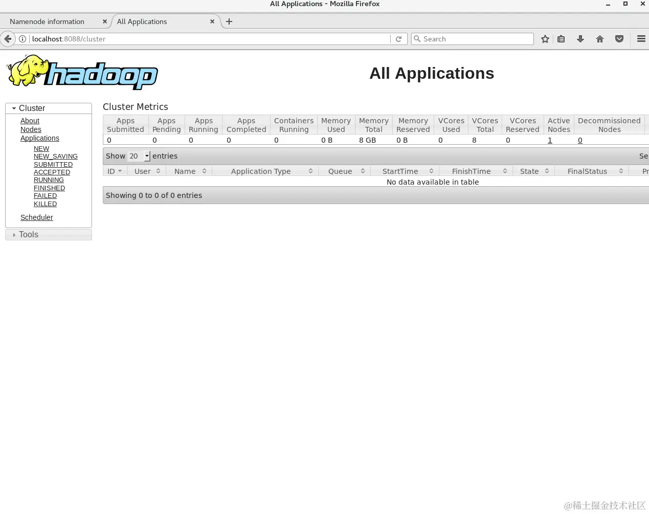 2.进入虚拟机浏览器地址栏localhost:50070和localhost:8088查看集群状态: