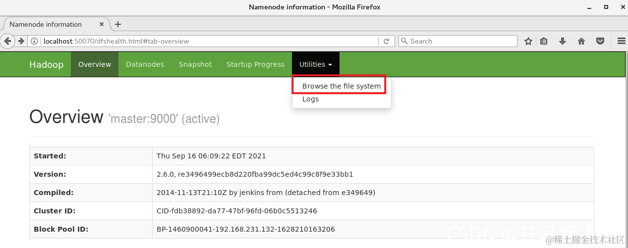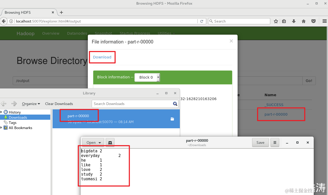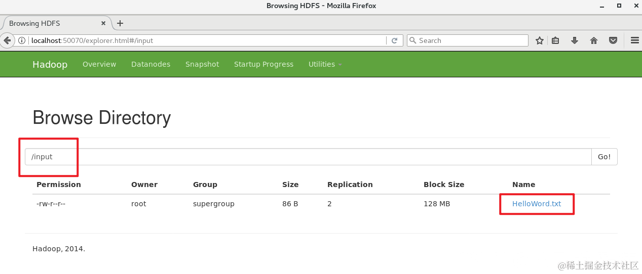 (4)在虚拟机浏览器地址localhost:50070找到/input目录下的HelloWord.txt