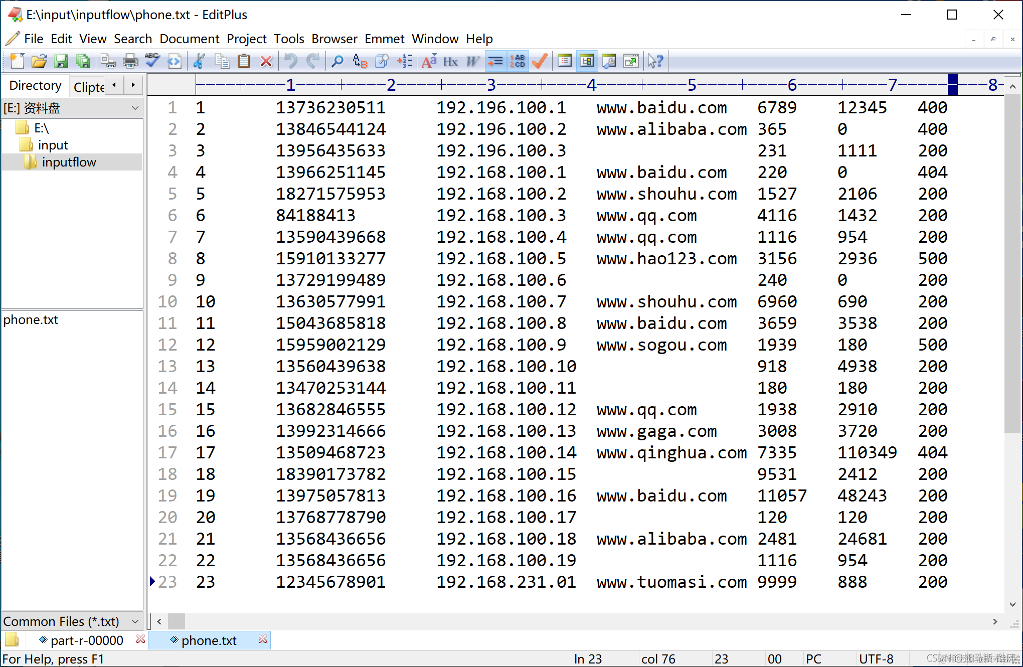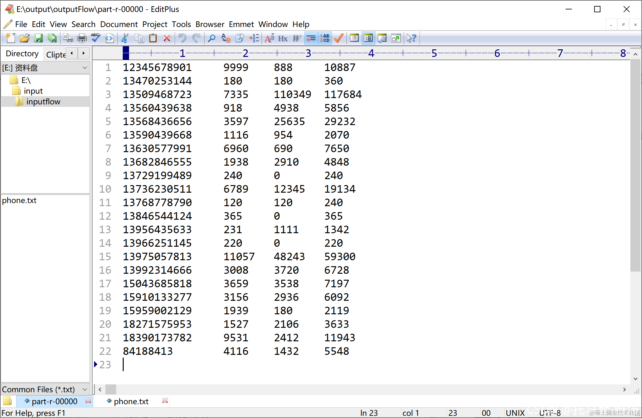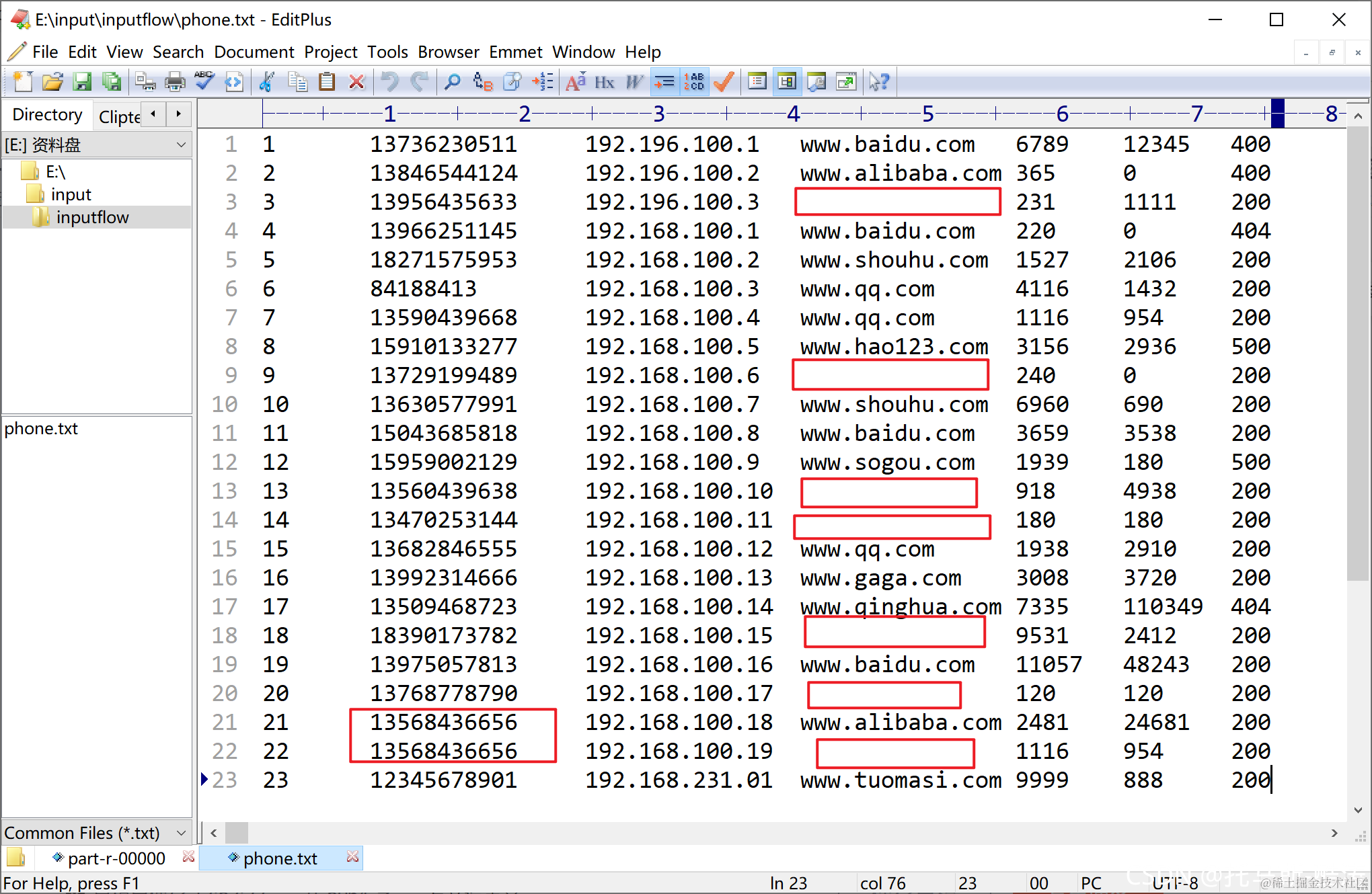 注意:输入数据中每一行的字段数不一定相同,且有空余字段,电话号码有相同号码却分为多行,此时需进行相同号码合并数据然后通过计算输出总流量,最后以电话号码数字大小作为排序输出。