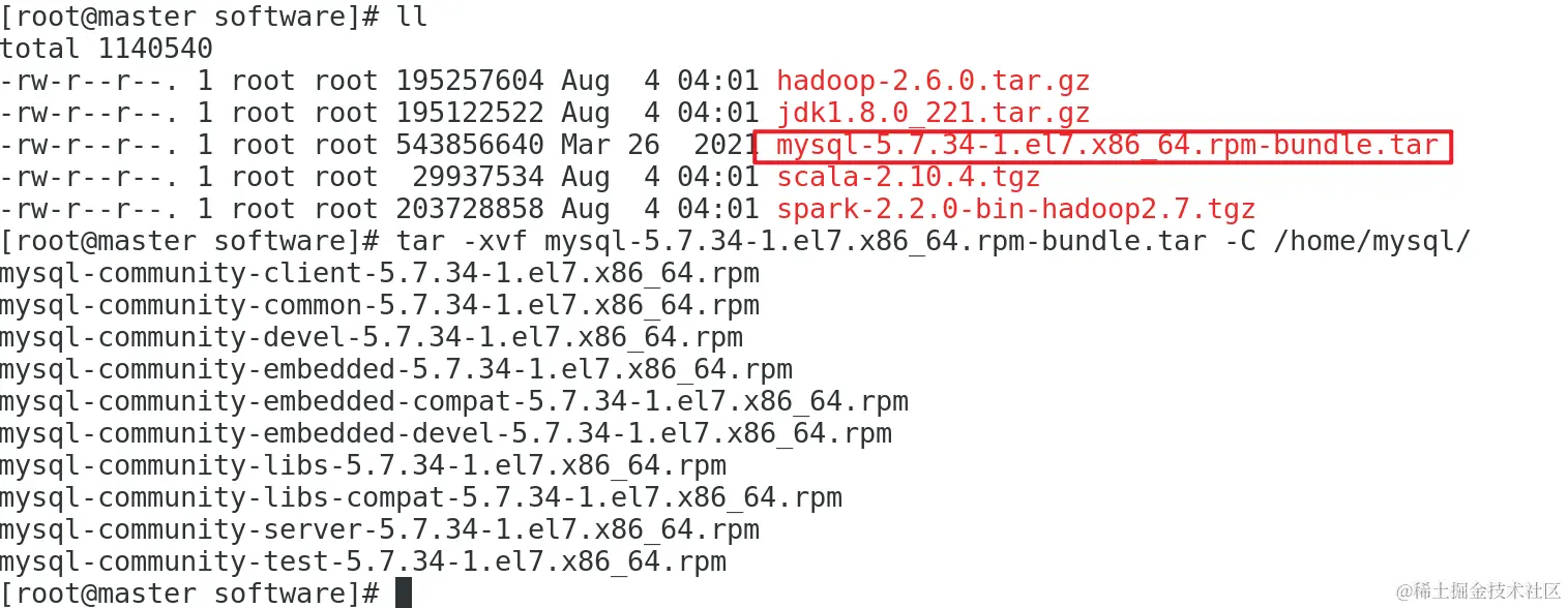 tar -xvf mysql包名(可以使用Tab键补全) -C /home/mysql/