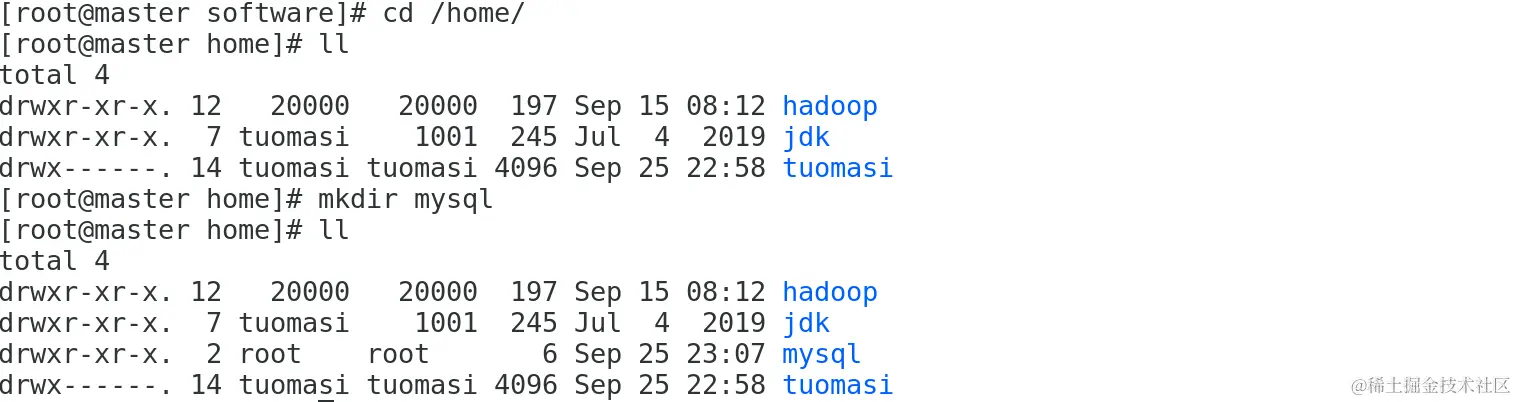 由于我的jdk,Hadoop都在 /home/目录下,所以此处将在/home目录下新建mysql安装目录