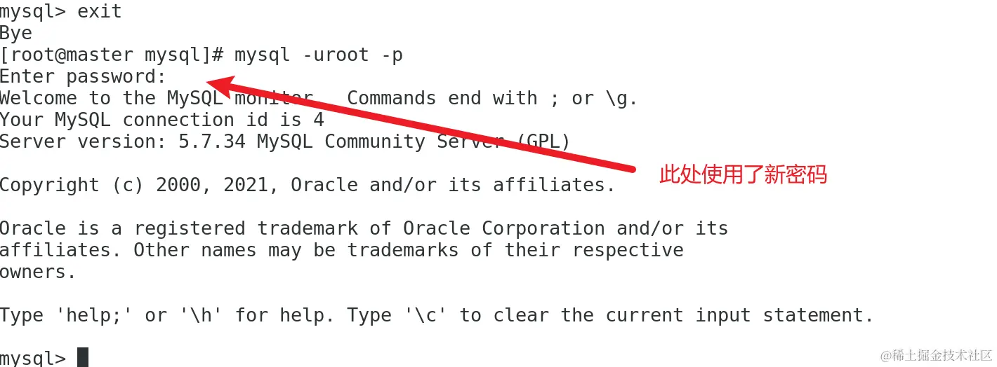 5、重新使用新密码登录MySQL: