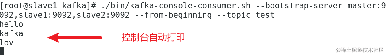 ./bin/kafka-console-consumer.sh --bootstrap-server master:9092,slave1:9092,slave2:9092 --from-beginning --topic test