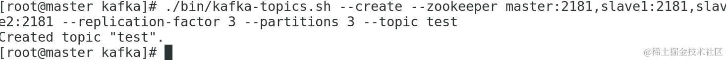 ./bin/kafka-topics.sh --create --zookeeper master:2181,slave1:2181,slave2:2181 --replication-factor 3 --partitions 3 --topic test