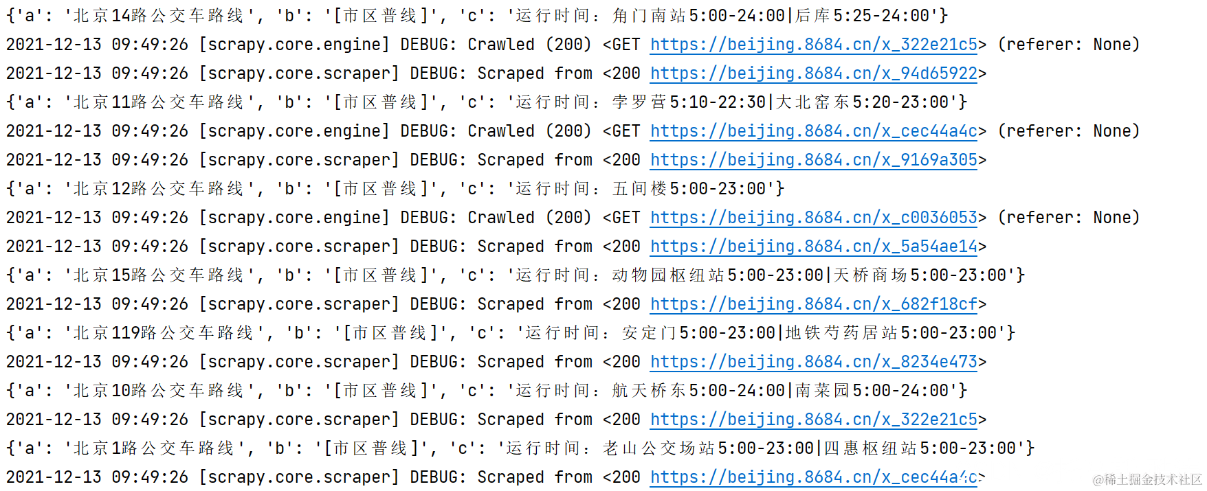 进入beijingbus/目录下执行 "scrapy crawl bei_bus"命令