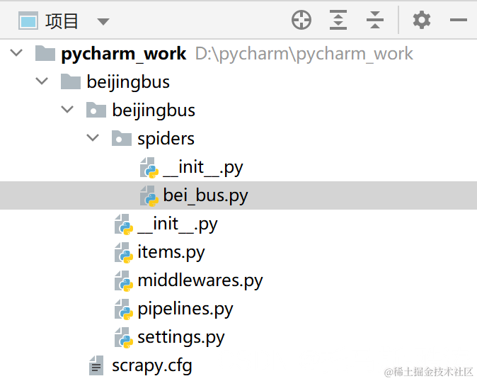 beijingbus/spiders/:放置spider代码的目录,用于编写用户自定义的爬虫