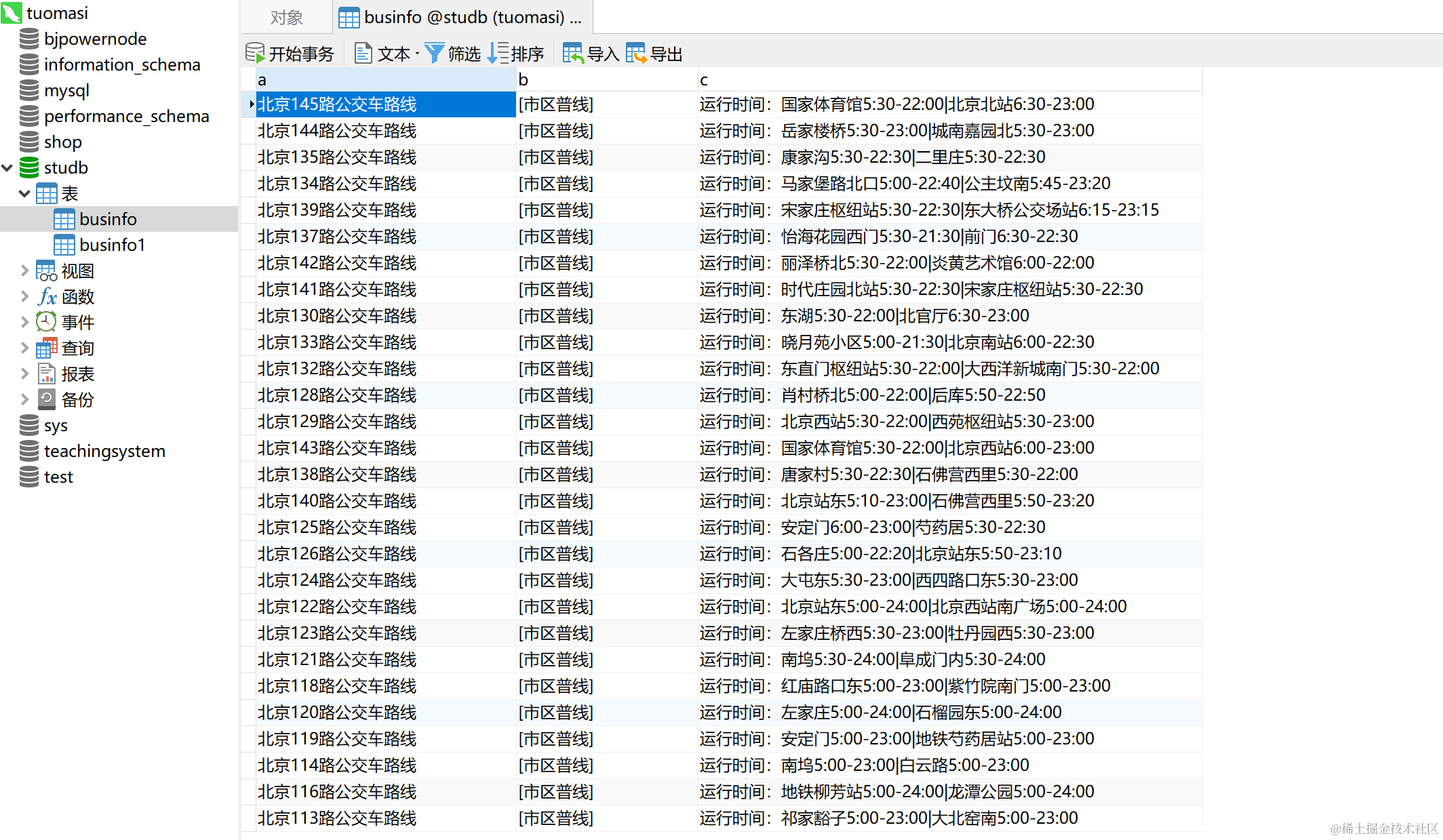 A、在 MySQL 的 studb 数据库中创建一个 businfo 表: