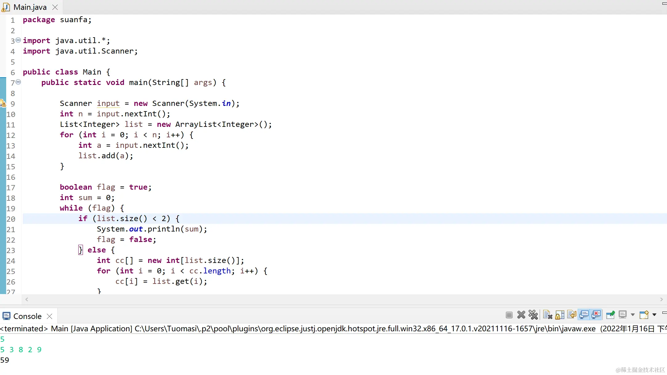 5. 现在,数列中只剩下一个数27,构造过程结束,总费用为5+10+17+27=59。输入的第一行包含一个正整数n(n<=100)。